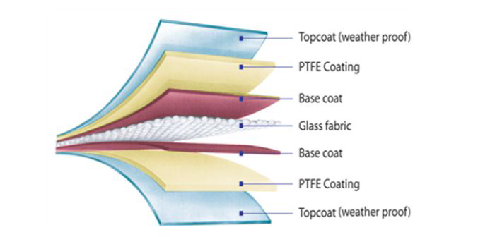 PTFE建筑膜材,全称:玻璃纤维基PTFE涂层复合材料PTFE膜材的结构:各层材料依次为:1:glassfabric 玻璃纤维基布2:base coat 胶连层
